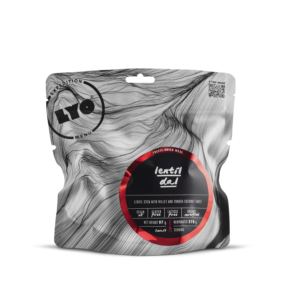 Индийска класика, пренесена в планината. Lentil Dal е плътна и ароматна яхния от червена леща, задушена бавно в кремообразен кокосово-доматен сос, допълнена с безглутеново просо и фино хрупкави зелени лещени зърна за текстура. Това напълно растително ястие е перфектно решение за всяко outdoor приключение – засищащо, вкусно и 100% органично.