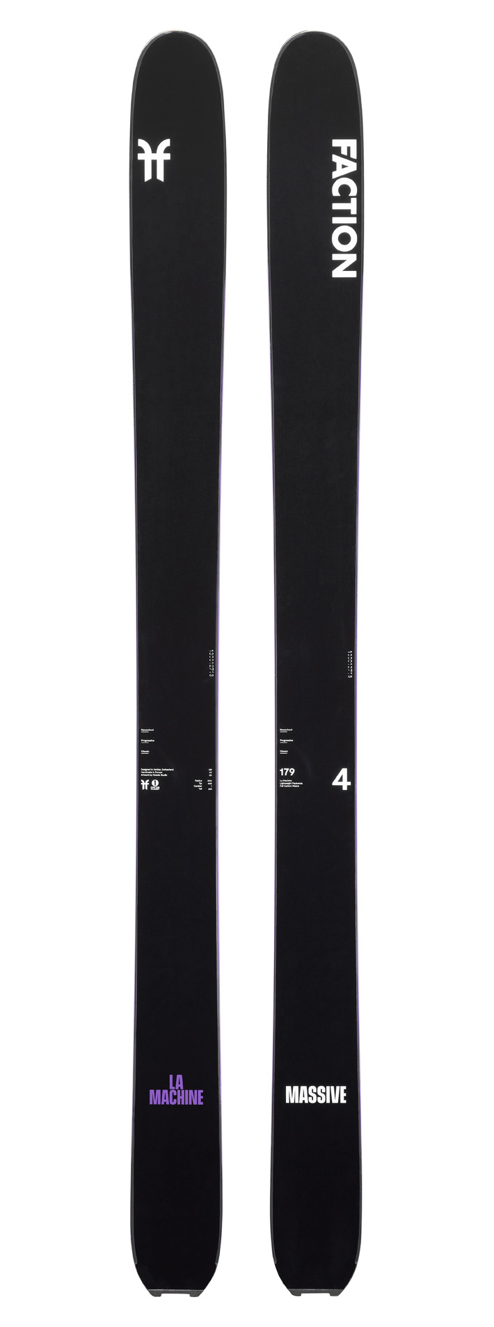 Faction La Machine Massive 4 е перфектните ски за фрийрайд скиорите, които жадуват за широки, но леки ски за продължителни ски турове, където дълбокият сняг присъства в менюто. Със скромната ширина на талията от 117 мм, La Machine 4 Massive се държи стабилно и върху по-твърд сняг, благодарение на леката сърцевина от пауловния и карбонов слой, поставени в конструкцията на ските.